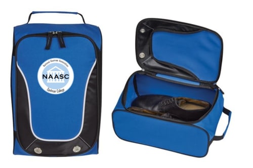 Our NAASC branded Shoe Bag is made of 600D Dobby Material with a double zippered main compartment, air vents, and a web carrying handle.